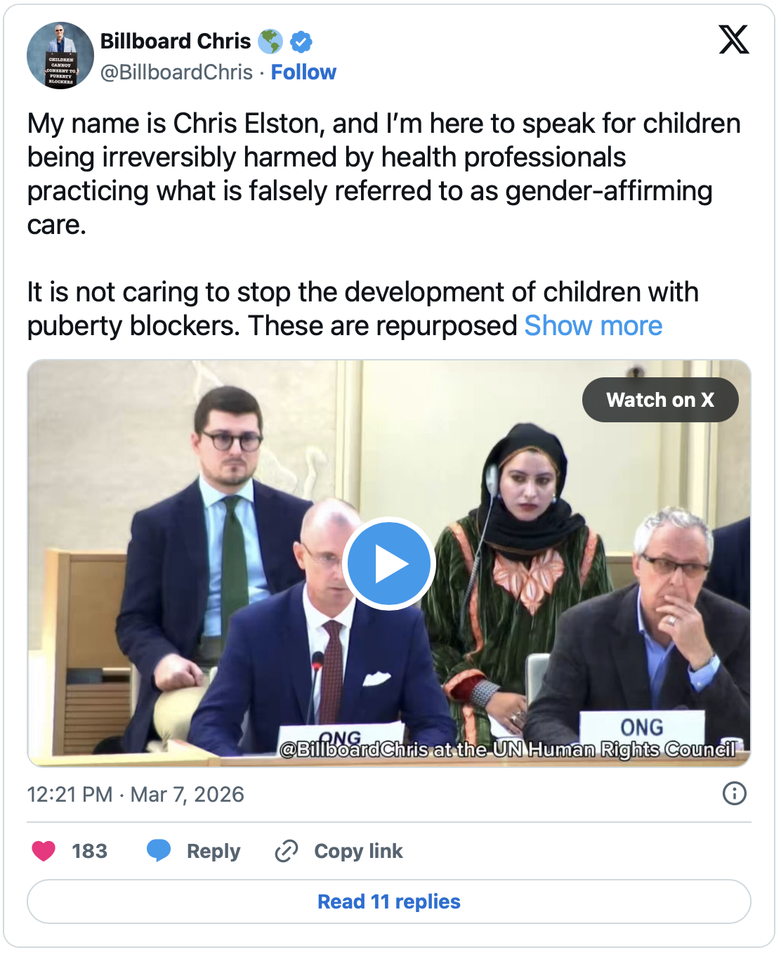 Speaking before the United Nations Human Rights Council this week, Chris Elston (Billboard Chris) argues that so-called gender-affirming care for minors is causing irreversible harm to children. He testifies truthfully that treatments such as puberty blockers, cross-sex hormones, and surgeries interfere with normal development, sterilize young people, and remove healthy body parts.